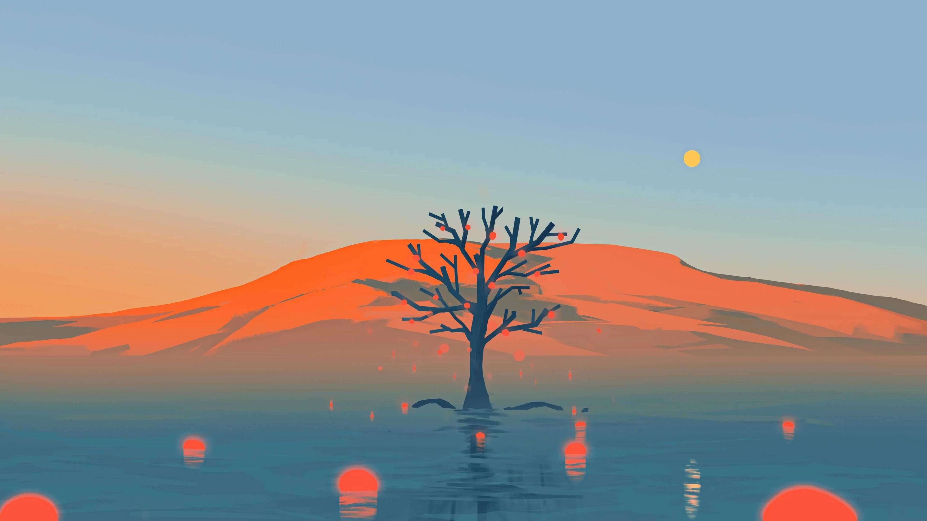 在这幅插画中,太阳正缓缓下沉至地平线以下,将天空和山丘染成了一片温暖的橙红色。树的剪影清晰地映照在水中,与远处的山丘形成了一幅和谐的画面。水面上的倒影和远处的圆形光斑增加了画面的深度和神秘感。《孤树残阳》不仅是一幅壁纸,更是一幅展现自然美景的画作,让人感受到日落时分的宁静与壮丽。